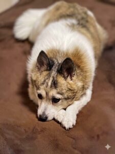イチゴ柄の毛布に包まれて小さなベッドで静かな寝顔を見せる白地に背中の茶色の模様、すっと伸びたマズルが印象に残る整った顔立ちのワンコ。この子が にーなちゃんです。